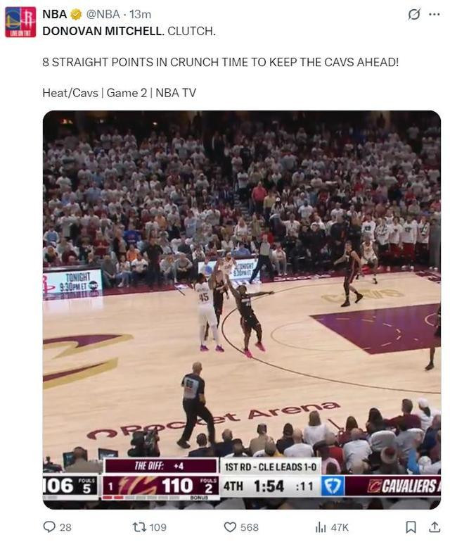 在比赛的最后时刻,米切尔展现出了他惊人的得分能力。末节还剩4分26秒时,泰勒的突破命中让比分差距缩小至2分。此时,米切尔接管了比赛,他在短短130秒内连拿10分,其中包括4分02秒的突破得分、2分58秒的抛投得分、2分27秒的三分命中以及1分52秒的决胜三分。这波攻势不仅稳定了骑士的战局,也点燃了全场球迷的热情。