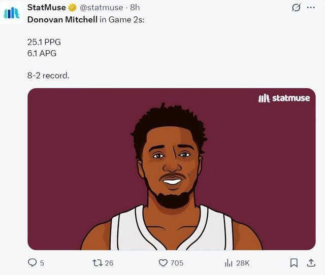 值得一提的是,米切尔在季后赛中的表现一直备受关注。美媒晒出了他生涯G2场均25.1分和6.1助攻的数据,战绩为8胜2负。这表明他在关键时刻总能挺身而出,带领球队取得胜利。米切尔的出色表现也让他成为了骑士队的灵魂人物,他的每一次投篮都牵动着球迷的心。